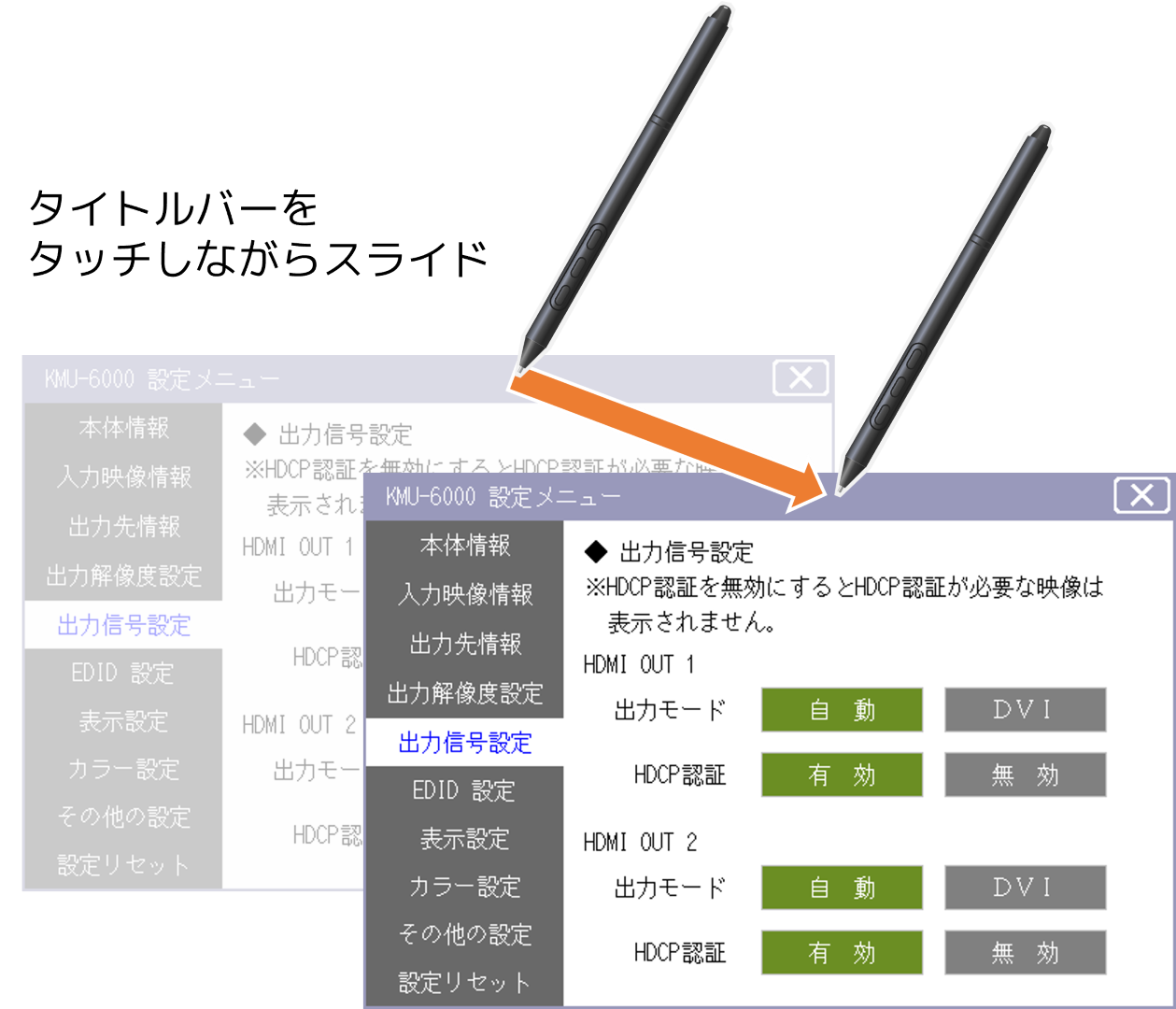 設定メニューの表示位置は設定メニューのタイトルバーをドラッグすることで移動できます。