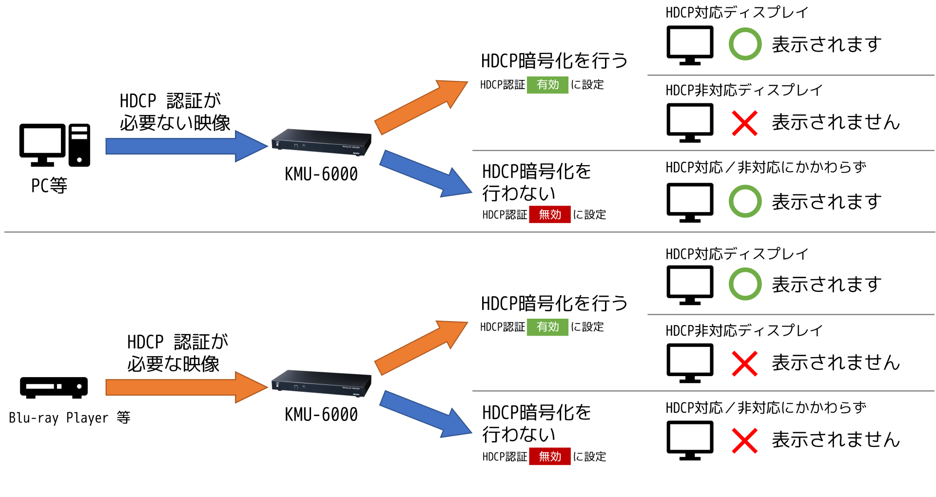 HDCPの有効/無効、HDCP対応/非対応ディスプレイの関係は以下の通りです。