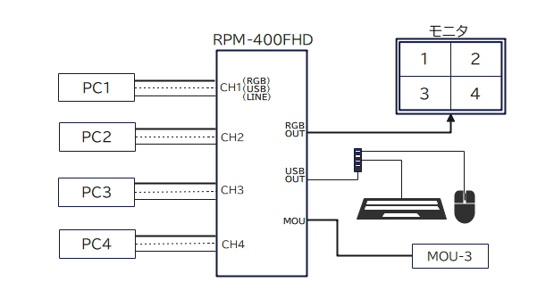 コントロールは全てホットキー対応チャンネル切替や表示モードの変更など,全機能をホットキーでコントロールすることができます。RPM-400FHDにキーボードを接続されない場合は別売の操作ユニットをご用意しています。 |