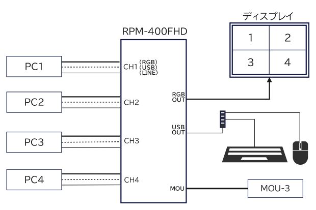 コントロールは全てホットキー対応チャンネル切替や表示モードの変更など,全機能をホットキーでコントロールすることができます。RPM-400FHDにキーボードを接続されない場合は別売の操作ユニットをご用意しています。 |