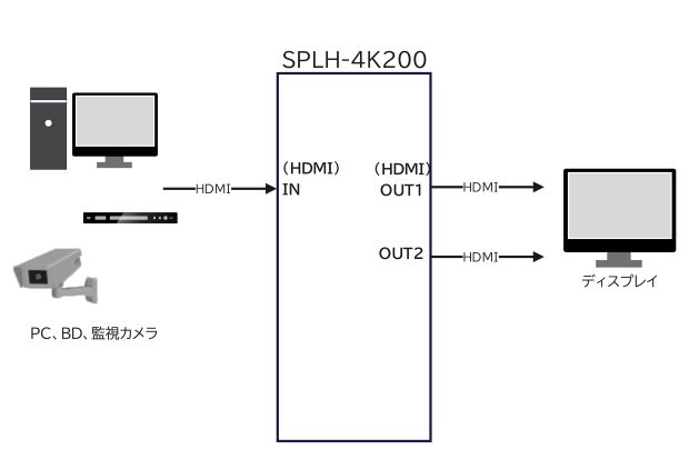 4K(3840×2160ドット)の高解像度に対応SPLH-4K200はパソコンや AV 機器の画面を2台の映像表示機器にそれぞれ画面分配表示ができる業務用のHDMI分配器です。従来のアナログRGB信号やビデオ信号と異なり、4KUHD(3840×2160ドット)の解像度の画像を劣化させることなく、鮮明に表示することができます。ハードウェア方式を採用し、ソフトウェアをインストールする必要がありません。ケーブルをつなげばすぐに使用することできます。 |
